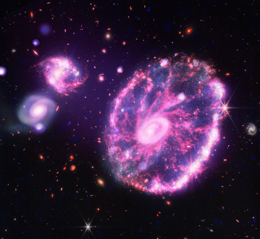 -- The Cartwheel galaxy gets its shape from a collision with another smaller galaxy — located outside the field of this image — about 100 million years ago. When this smaller galaxy punched through the Cartwheel, it triggered star formation that appears around an outer ring and elsewhere throughout the galaxy. NASA's James Webb Space Telescope.